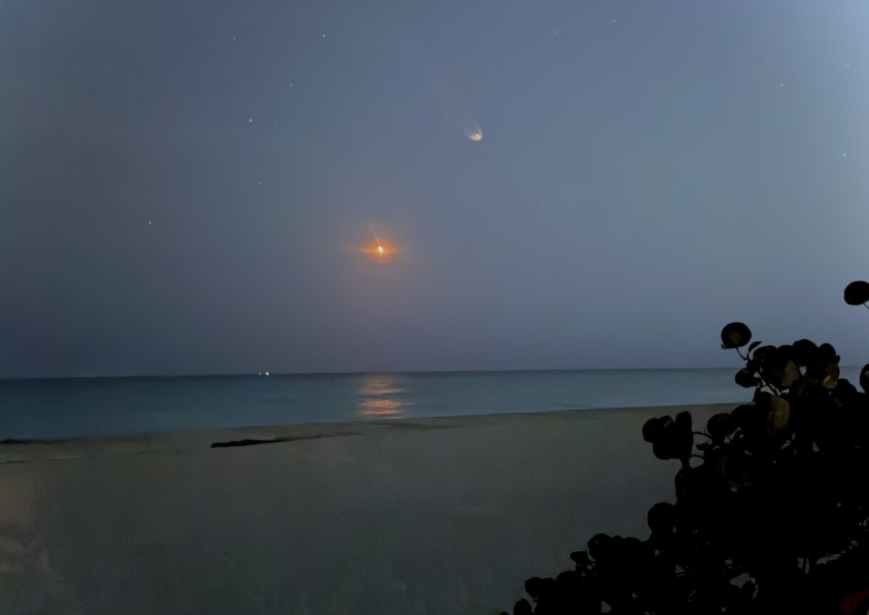 When there are rockets launched from Cape Canaveral Florida, we are able to see them from anywhere along the Juno and Jupiter Beaches in Southern Florida. The most visible launches are those where the flight path is southerly and at night. And often SpaceX launches will return the booster to a drone ship that is nearly directly off the coast. While the drone ship and the actual landing is not visible, the engine burn as it descends to the drone ship can be very visible.