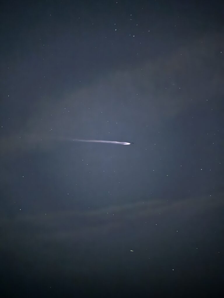 Images below are from a SpaceX Falcon 9 Launch on Dec 30th, 2024 at 12:40AM. Taken from Jupiter Beach, FL. Main rocket is heading down range towards orbit to deploy Starlink satellites. The booster is coming back to land on the drone ship and is visible through the clouds along with the reflection of the engine exhaust on the water.