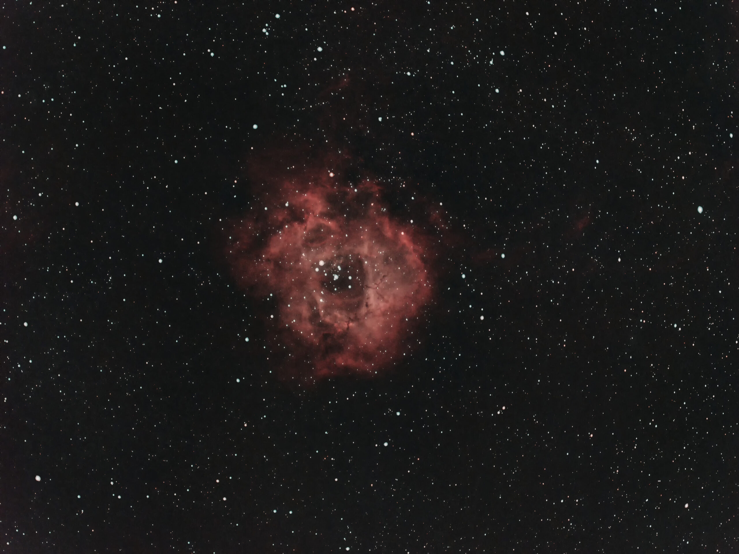 The Rosette Nebula (NGC2237) is an emission nebulae in the constellation of Monoceres not far away from the bright star Betelgeuse in the constellation of Orion. It cloud of hydrogen gas is illuminated by the young star cluster NGC 2244 at its center. Stellar winds from these stars energize the surrounding gas, causing it to glow strongly in hydrogen-alpha light (pinkish/red in the image).